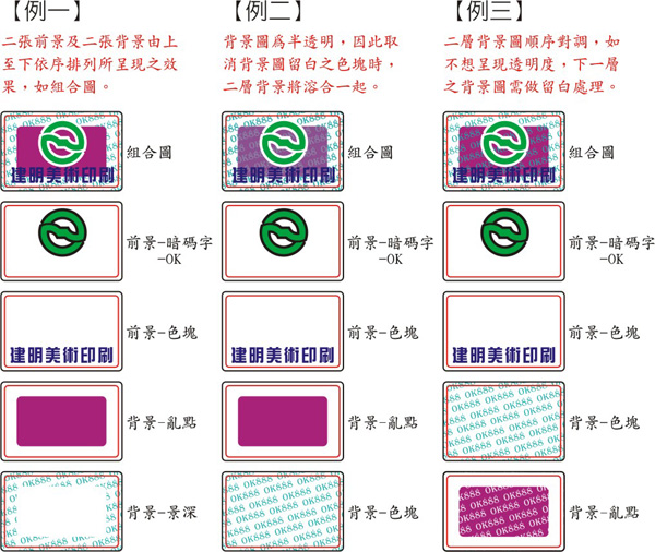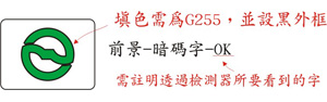 A.完稿時設定為暗碼字的區塊,面積須大於 2x2mm,填色需為G255,並設黑外框,背景圖盡量避免太複雜之效果,以免干擾。
