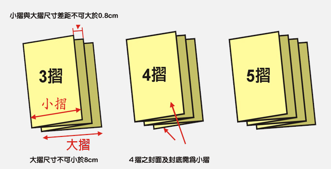 階梯摺:有分大摺頁及小摺頁,大摺之寬度不可小於 8cm,大摺與小摺的尺寸差距不可超過 0.7cm。