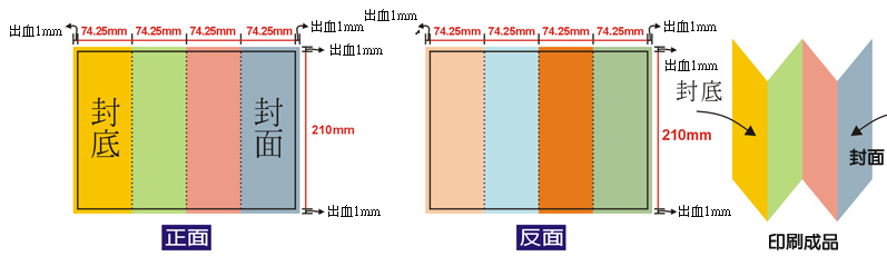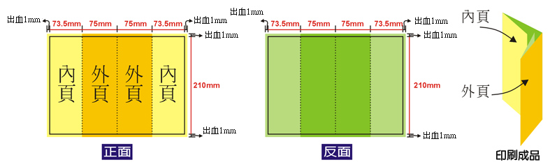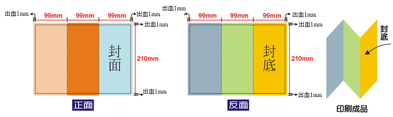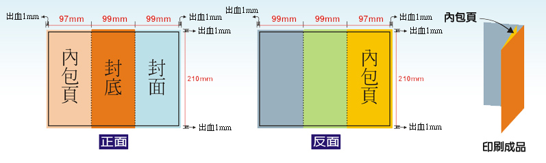 包摺:製作時,包在裡面的一頁其尺寸需小於其他二頁 2mm以上,其他二頁尺寸一樣,參考上圖。