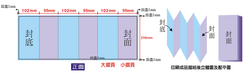開門摺:其展開後最外面二頁尺寸需小於其他二頁 1.5mm,可參考上圖。